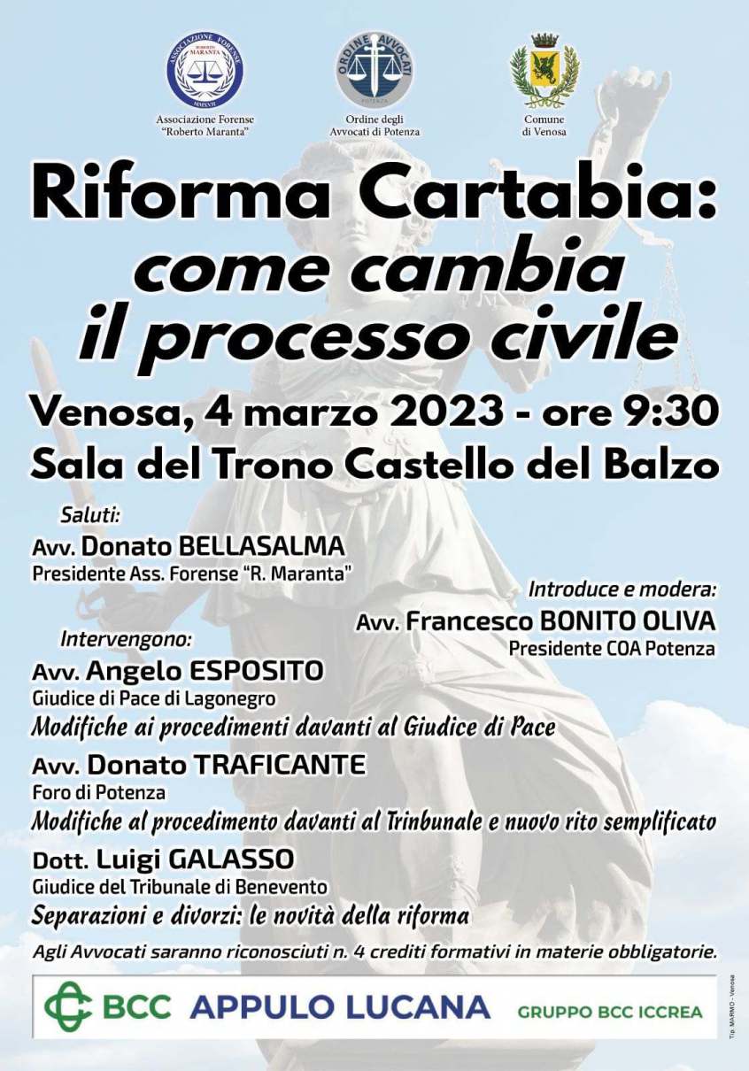 Lo scorso 4 marzo si è tenuto a Venosa il primo ciclo di incontri organizzati dall'associazione forense "R. Maranta" sull'impatto della Riforma Cartabia nei procedimenti civili